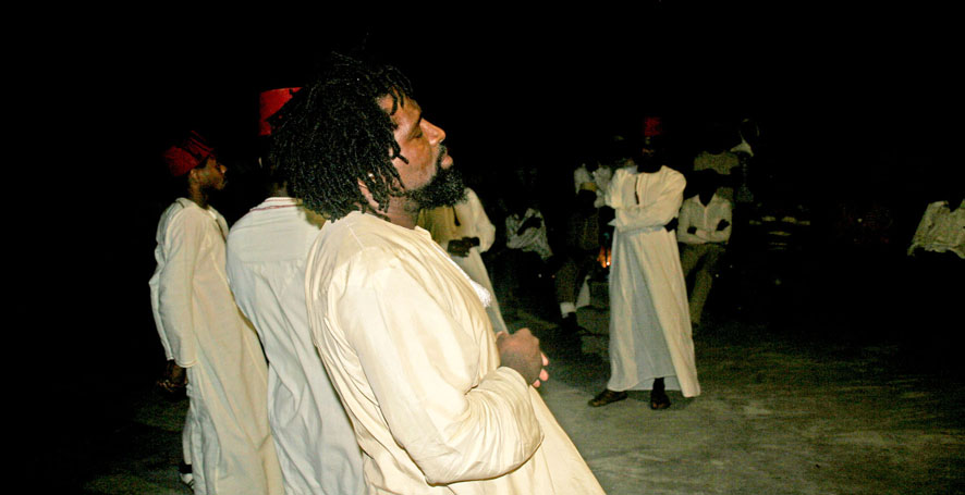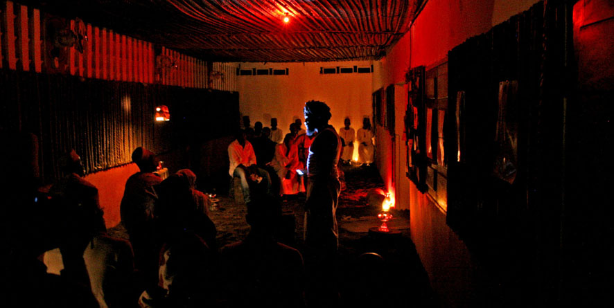 Chaque soir, c’est une vingtaine de personnes triées sur le volet, faute de places, qui s’engouffre derrière la grille en fer du Muzdalifa House pour partager cette parole d’artiste : une « complainte de kwasa », selon ses interprètes. Atmosphère intimiste dans une salle de 15 mètres de long sur 4, au sol de béton recouvert de terre argileuse. Scénographie originale censée rappeler le principe de la terre perdue ou confisquée : Mayotte la quatrième île de l’archipel « occupée » par la France. La terre rappelle également ce qui manque à ces disparus. « Dans un pays où l’on accompagne le deuil avec force rituels, la terre à toute son importance. Nous n’avons pas pour habitude d’enterrer nos morts sous la mer. D’habitude, nous les recouvrons de terre dans des cimetières » explique Soeuf Elbadawi. Des lampes à pétroles, un tapis de prière en feuilles tressées de cocotier, de l’encens qui brûle sur les murs, des troncs d’arbre en guise de sièges. Un dhikri pour nos morts se joue à même le public. Lorsqu’ils entrent dans le lieu devenu sanctuaire d’un soir, les spectateurs découvrent des hommes en kandzu blanc assis au fond du plateau. Un chœur soufi, interprété par le collectif des Nurul’Barakaat, sous la direction de Mourchid Abdillah, ramène au sacré des liturgies de la confrérie shadhuli, implantée dans le pays depuis le XIXe siècle. Le dhikri est un rituel d’invocation divine souvent utilisé pour commémorer le 40ème jour de morts illustres. « Nous pratiquons un théâtre au caractère quasi matrilocal. Nous puisons notre inspiration, notre énergie, notre dramaturgie dans nos traditions. Le soufisme nourrit notre rapport au monde. Ils sont nombreux, les Comoriens qui s’en réclament. Il ne faut donc pas s’étonner de le retrouver en bonne place dans nos propositions ».