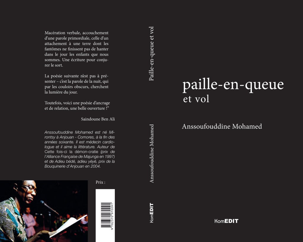 Réédition de l’excellent Paille-en-queue et vol, premier recueil publié du poète Anssoufouddine Mohamed, aux éditions Komedit. L’enfant de Mirontsy, cardiologue de profession, est connu dans l’archipel pour son action autour de la mémoire et du désir de l’Autre. A lire et à relire.
