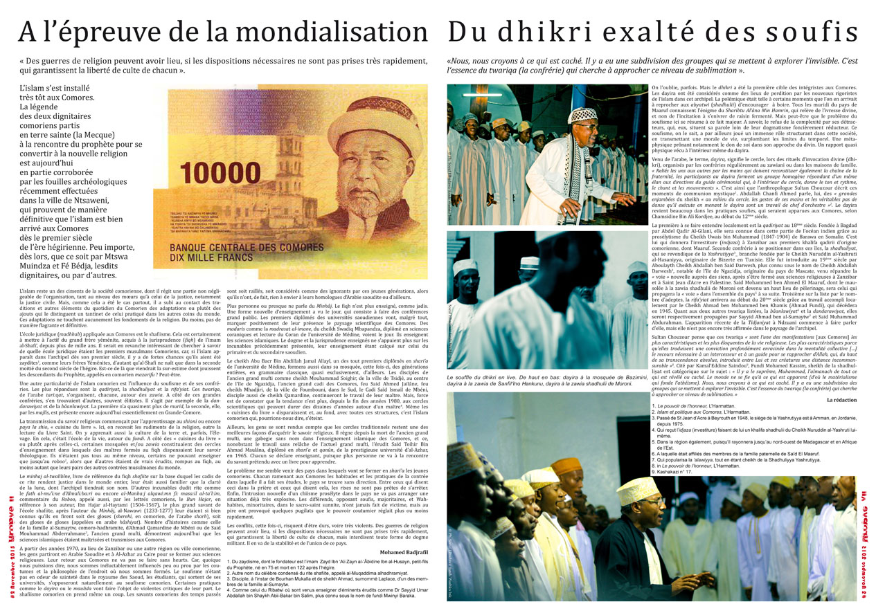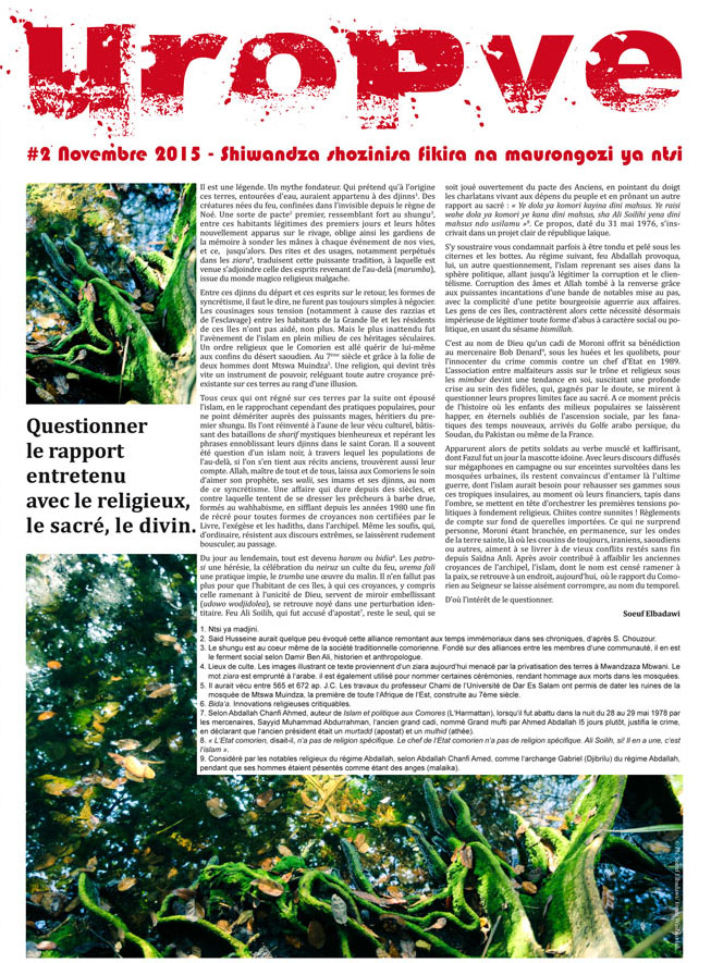 Le premier numéro évoquait le rapport entretenu par les Comoriens avec le politique. Le second s’intéresse au religieux, au sacré, au divin. Un tour d’horizon presque complet sur l’archipel et ses croyances. L’islam, les entités parallèles, la main de l’homme. Tout y passe. Avec des contributions d’une qualité rare. De la part d’un journaliste (Kamardine Soule), d’un imam érudit (Mohamed Badjrafil), d’un ambassadeur anthropologue (Sultan Chouzour), de l’équipe du Muzdalifa House (Fouad Ahmada Tadjiri, Mmadi Mihidjay, Soeuf Elbadawi), avec des écrits qui prolongent le débat sur le blog du Muzdalifa. On y trouve une contribution du Dr Anssoufouddine Mohamed, poète et cardiologue, sur les thérapies d’hier et d’aujourd’hui, dans l’archipel.