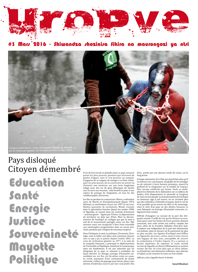 Pour le télécharger, cliquer sur ce lien : UROPVE#3. Ce numéro #3, paru en mars 2016, vous est gracieusement offert par ses lecteurs-contributeurs. Une manière citoyenne de partager l’info sur les réalités comoriennes. Uropve – qui n’existe pas en kiosque – prolonge un idéal d’utopie collective, largement inspiré du shungu des Anciens. Ou comment re fabriquer encore de l’en commun face à l’adversité..