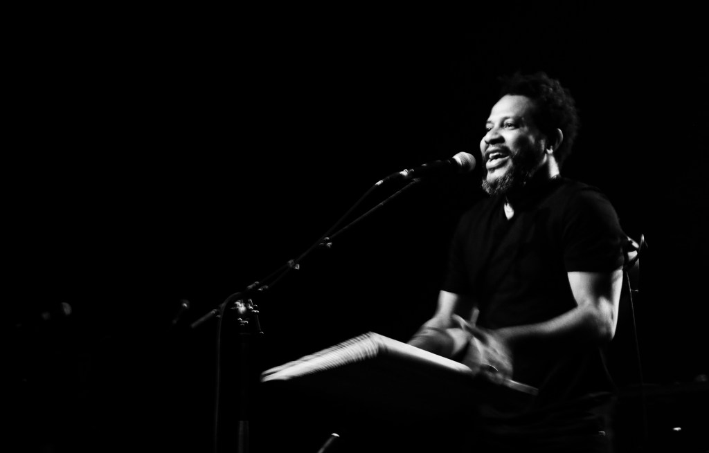 Et d’un coup, la main ouverte sur la bouche, à la manière des muezzins d’antan, l’artiste lance un long « haymeeeeee » qui interpelle. Un deuxième appel, cette fois, en virevoltant, puis il se met à descendre les marches vers la fosse. « Ça picole trop ici, c’est pas bon », lance-t-il au coin du bar, et poursuit son chemin. On se croirait dans une performance de spoken word : « bonsoir mesdames et mesdames ». Quelques rires timides fusent. Il poursuit : « On m’avait dit que le public ici était très, très, froid, ça se confirme, merci pour l’accueil ». Cette fois, ovations et applaudissements. L’artiste est déjà sur scène. Une bouteille vide à la main, il souffle dedans, avec des bruits de thorax, tel un joueur de flûte peul. Au pied, une stompbox, avec laquelle il donne une pulserégulière. Un appel rythmique auquel adhère aussitôt le public.