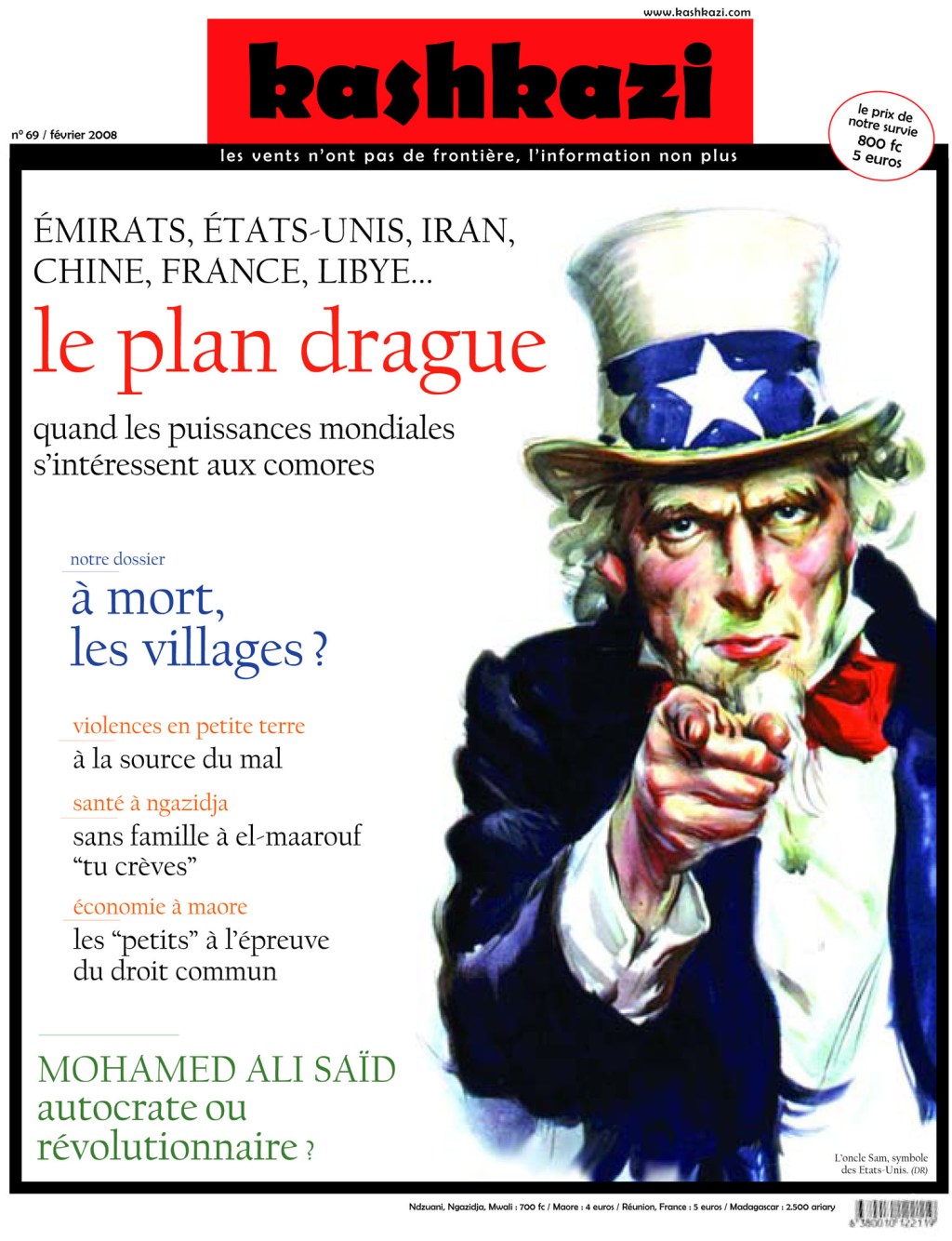 Certaines archives du journal Kashkazi sont désormais consultables sur notre site. Pour accéder au n° 69, cliquer ici. Au sommaire : l’intérêt des puissances mondiales pour l’archipel, l’économie des petits à Maore, géopolitique dans l’Océan indien, le débat sur les villages et leurs limites, la réalisatrice Hachimiya Ahamada, l’homosexualité…