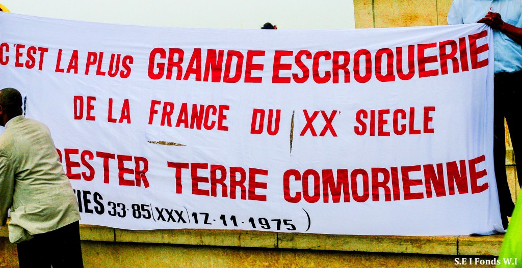 1975-2020 ou 45 années de tourmente pour l’archipel des Comores. Une génération de sacrifiés, sinon plus, est passée sous l’autel de la mémoire. A force de réécriture et de férocité coloniale, le pays a vu ses limites territoriales biffées, de manière sournoise et singulière. Ses propres enfants contribuent à l’ultime opération de dépossession entreprise par l’ancienne tutelle, qui use de Mayotte comme d’un espace-repoussoir pour asseoir à nouveau sa mainmise sur l’ensemble archipélique. La banderole au-dessus date d’une manifestation de la diaspora contre l’occupation de la quatre!ème île sur la place du Trocadéro à Parisen 2007.