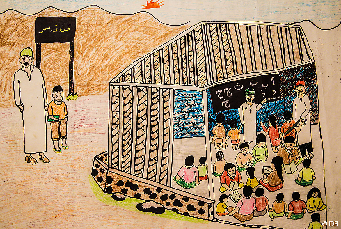L’école coranique où l’enfant apprend ses premiers mots en arabe, enseignée en langue shikomori. Le dessin provient d’un travail réalisé par des enfants du Nyumakele avec des élèves du lycée d’Excellence de Ndzuani, en partenariat avec l’association Maesha.