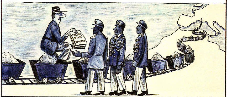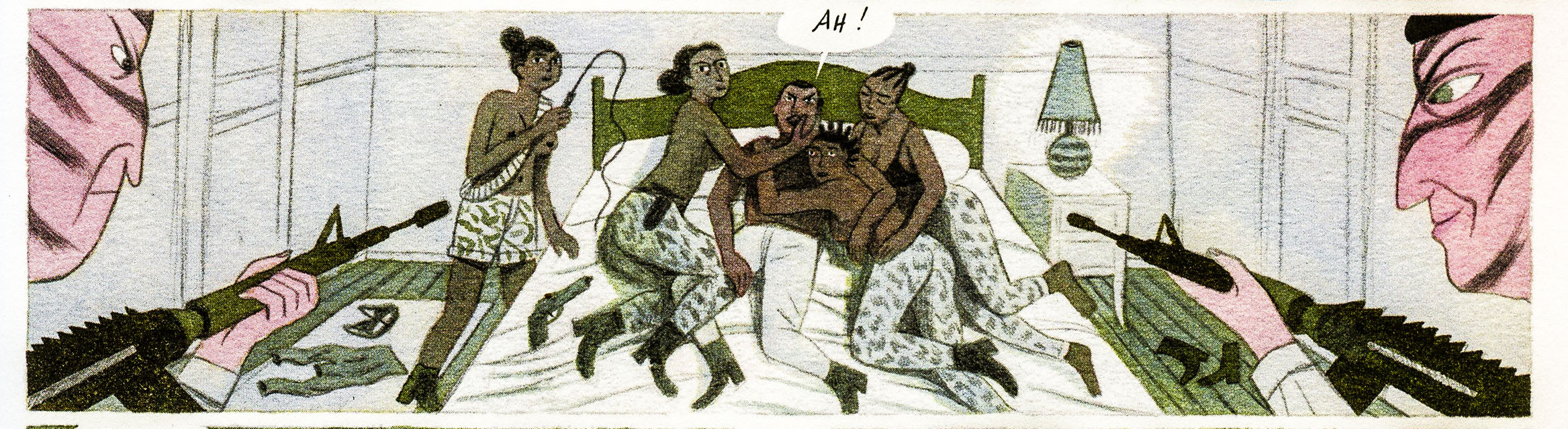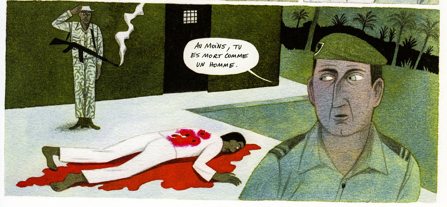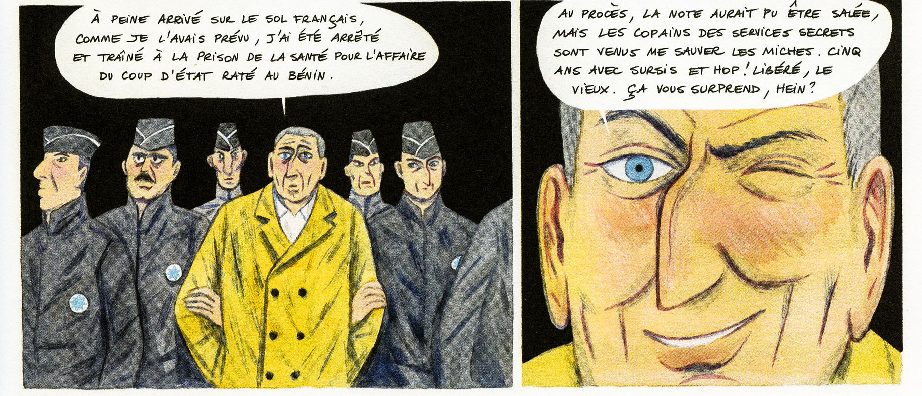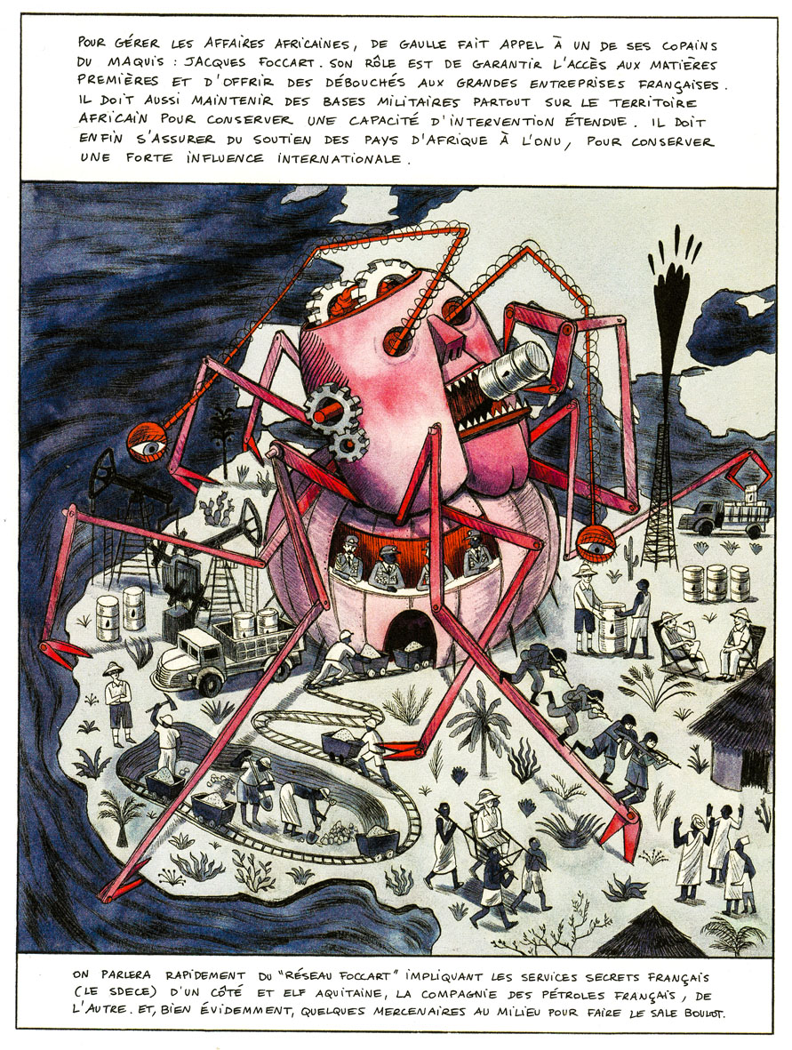 Il y a de l’humour crasse dans l’air. Le bidasse français est raciste en Indochine (« c’est le souci avec les viets : les gentils, les méchants, ils ont tous la même tête »). Jovial et Coignet sont-ils critiques ? On ne sait pas trop. Le ton en apparence décalé sous-entend plutôt qu’on peut rire n’importe comment de la violence coloniale. De quoi perturber le lecteur averti. On nous parle d’un attentat raté au Maroc contre Pierre Mendès France comme d’une mauvaise blague d’ultras à laquelle souscrirait Denard, sans trop de convictions. On se raconte surtout la colo en mode « débridée ». La mise au pas des souverainetés africaines. De Gaulle qui pompe les autres pour s’offrir ce que la France ne peut trouver sur son sol : minerais, uranium ou encore pétrole.