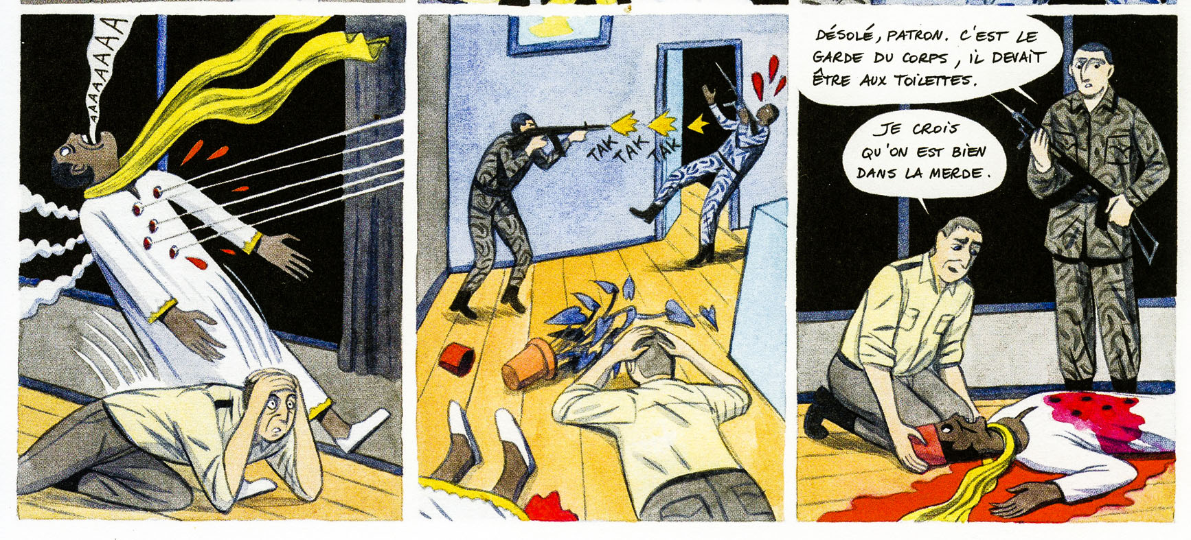 Désolé, cependant, d’avoir à l’écrire, mais le scandale de la Françafrique n’a rien de fascinant, ni de même de sympathique. Dans le cas des Comores, dernière destination connue du mercenaire français, on manquerait de s’étouffer, en découvrant cette BD. Les raccourcis sur Mayotte déroutent. Le paternalisme d’un Denard, exigeant une docilité exemplaire de la part du président Abdallah, pareil ! « Faudrait pas que j’aie à vous dégager une deuxième fois ». Il est certes écrit que les Comores représentent « une base arrière sur une île exotique au milieu de l’océan indien. Un passe-droit… » – mais cette envie de boire à la « santé » du « corsaire Denard » pétrifie. La relecture des événements y est hallucinante. L’attaque de la présidence en 1978 renforce le « dit » du dictateur déchu dans le stupre. Une fiction bien française ! Une attaque à Beït-Salam, au lieu de Mrodju, pour un intérêt scénaristique quelconque, fait ressortir des inexactitudes. Mais on ne se trompe pas seulement de palais. On fait aussi croire qu’Ali Soilih a fini flingué par les siens.