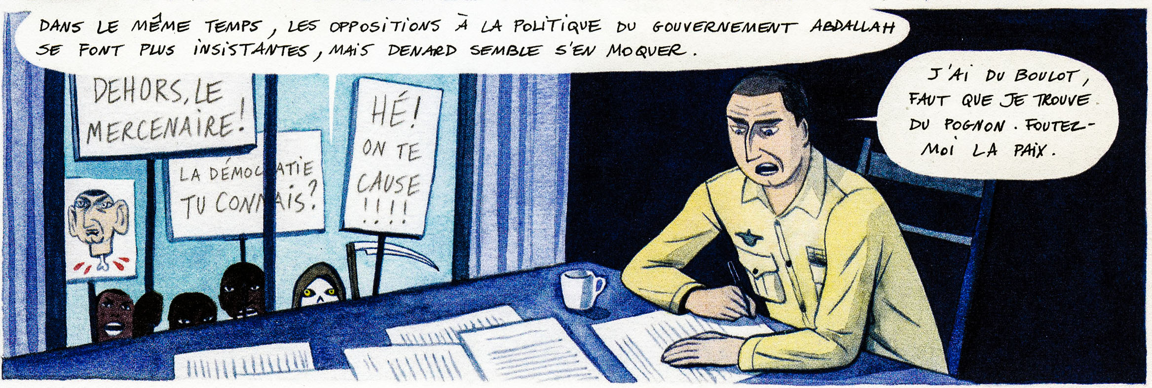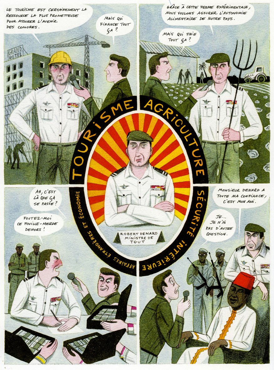 Mais les faits les intéressent-ils, concrètement ? Nulle trace de l’empoisonnement du président Taki dans la villa du fils Denard (dont ils parlent de la naissance au Maroc, pourtant) à Marbella. Jouvray et Coignet consolident le mythe. « Le problème avec les grands bouleversements de l’histoire, est-il écrit quelque part dans ces pages, c’est qu’on ne peut vraiment les comprendre qu’une fois qu’ils sont passés ». Ces auteurs ont-ils saisi les limites de leur personnage ? Difficile de ne pas en douter, même s’ils donnent parfois l’impression de ne pas être dupes, grâce à quelques allusions grinçantes, semées ici ou là. En dernière page, le personnage, malgré sa névrose, adresse librement ces mots au lecteur – « je ne sais pas ce que vous pensez de tout ça… mais pour moi ça valait le coup » – et on se dit qu’après tout ce n’est qu’une BD. Sauf que Denard, vu des Comores, n’a rien de cet « anti héros » qui fascine. Au risque du récit à thèse dégoulinante, les faits y restent têtus, alors que Jouvray et Coignet nous représentent un Denard audacieux, plutôt pris de court par les événements. Rien n’indique leur volonté de saisir la complexité d’un système de domination, dont les effets se font sentir encore, de nos jours.