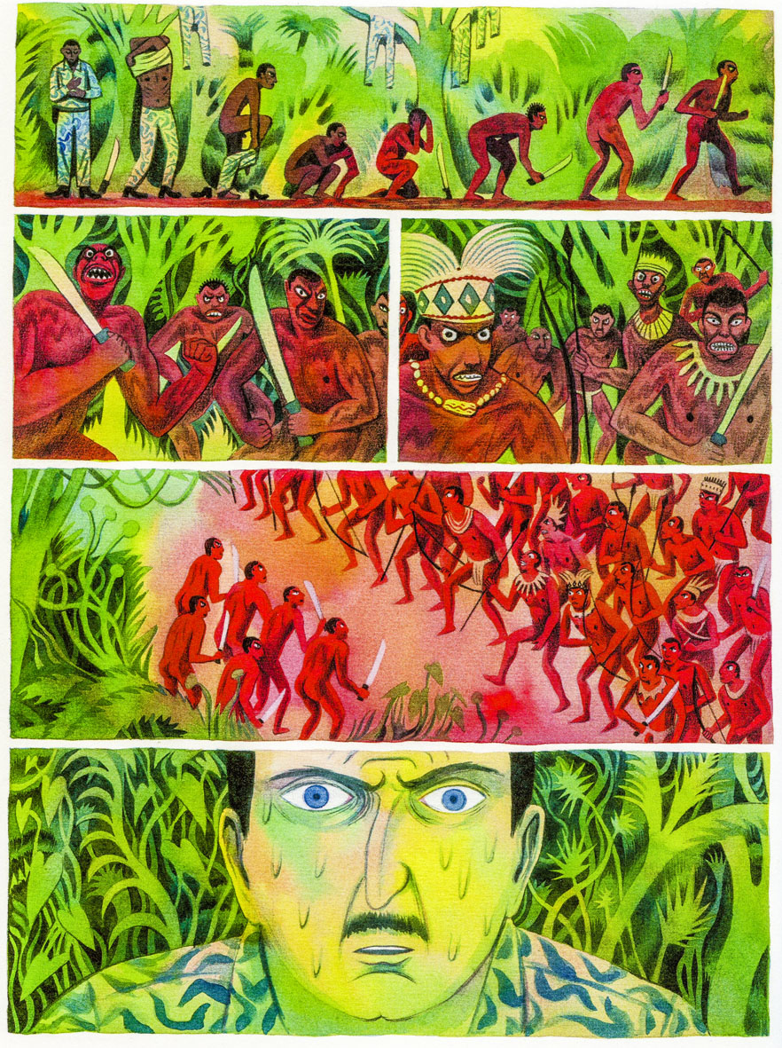 Le héros de la France libre fait appel à Foccart – son pote de maquis – pour garantir aux entreprises françaises l’accès aux matières premières et pour tirer les ficelles des Etats nouvellement indépendants sur le Continent. C’est le temps venu du SDECE (services français), des magouilles d’Elf Aquitaine, des chiens de guerre, dont Denard demeure l’un des pires clichés. Jouvray (et sa maudite tête d’ange de la mort) transforment le bordel organisé au Congo en un sandwich indigeste pour quiconque en connaît l’histoire, tout en sacralisant Denard le mercenaire (« fameux », « légendaire »). Il nous conte gentiment les limites de cette Afrique, qui, en tentant de relever la tête, ne peut s’empêcher de dégainer le coupe-coupe. Une Afrique qu’il faut à chaque fois raisonner. D’où l’intérêt (peut-être) d’un Denard, qui, au Katanga en 1961, continue à « raisonner » du bon sauvage.