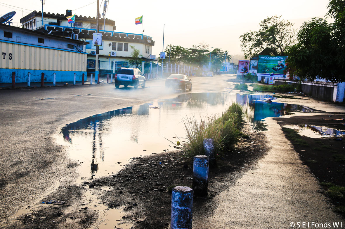 Flaque d’eau stagnante, vers le port de Moroni, sur la route principale. Le Kalawe et ses boutres, au siècle passé. Un autre Moroni est à inventer, mais doit-on effacer les traces du passé à ce point, pour autant ?