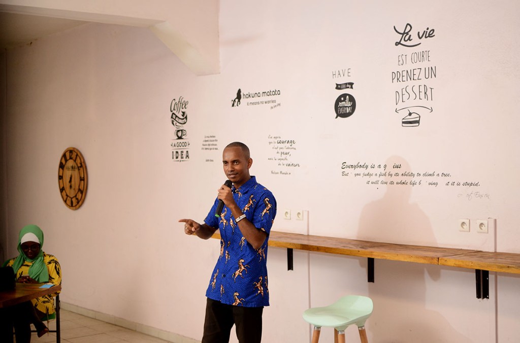 Fouad se souvient de sa première scène en 2008. Dans le rôle du slammaster pour les Slameurs de la lune. Rien à voir avec le stand up au sens strict du terme, mais la sensation, quand même, de jouer en funambule sur une pente des plus indescriptibles. « J’ai animé plusieurs soirées slam pour d’autres clubs. J’essayais toujours de mettre une touche d’humour dans mes interventions. Ce n’est qu’en 2015 que je me suis lancé dans le stand up, grâce à Pierre Barbier, le directeur de l’Alliance française de Moroni à l’époque. Il a fait venir un de ses amis, un humoriste camerounais, Valery Ndongo ». Ce dernier présente son show et propose un atelier d’initiation au genre. Fouad y prend vite goût. Avec trois autres camarades – Faykal, Madjid et Nounou – ils décident de créer le Comores Comedy Club (CCC), sous la supervision de l’Alliance française et le soutien du Service de Coopération et d’Action Culturelle de l’Ambassade de France. Un guichet unique pour un certain nombre d’artistes de la capitale.