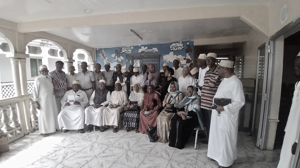 Photo de groupe avec d’anciens soixante huitards, lors de la rencontre autour du livre de Mbaye Trambwe, au CASM à Moroni.