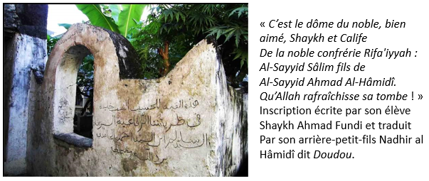 La plupart des érudits soutiennent que la rifa’iyyah a été introduite dans l’archipel par le shaykh Ahmad bin Muhammad al Khamis al Marzuk al Hadhrami[3], mais les disciples commémorent la mort du shaykh ayant initié les premiers enseignements, en la personne de Sayyid Sâlim bin Sayyid Ahmad al Hâmidî, dont la tombe et son zawia se trouvent à Mutsamudu à Ndzuani. Il est né à Itsandra[4] au cours de l’année 1829. Son père était Sayyid Ahmad[5] bin Abû Bakr al Hâmidî. Sa mère s’appelait Bweni Amina[6] binti Sultan Safuwân bin Sayyid ‘Alawi al-Masela dit Sambi la Hariri[7]. Shaykh Sayyid Sâlim a grandi et a étudié auprès de son père. Entre Itsandra-Mdjini, Mutsamudu et Funguju[8]…