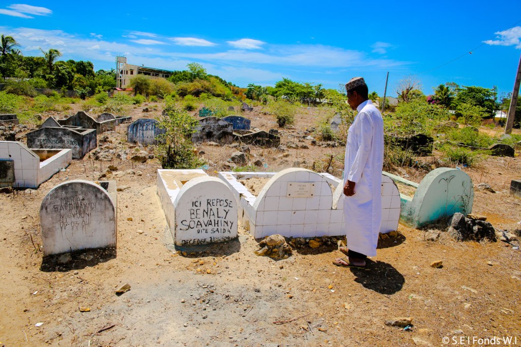 L’entrée à Majunga du cimetière Sheikh Ahmed Vita, où sont enterrés les morts du Samson. Une des tombes portant le nom (Zalihata Mohamed Youssouf) et la date du naufrage (07.03.04). Fundi Hadji Toiouilu – notre guide en ces lieux – est l’un des derniers « gardien de la trace » au sein de la communauté comorienne de Majunga.