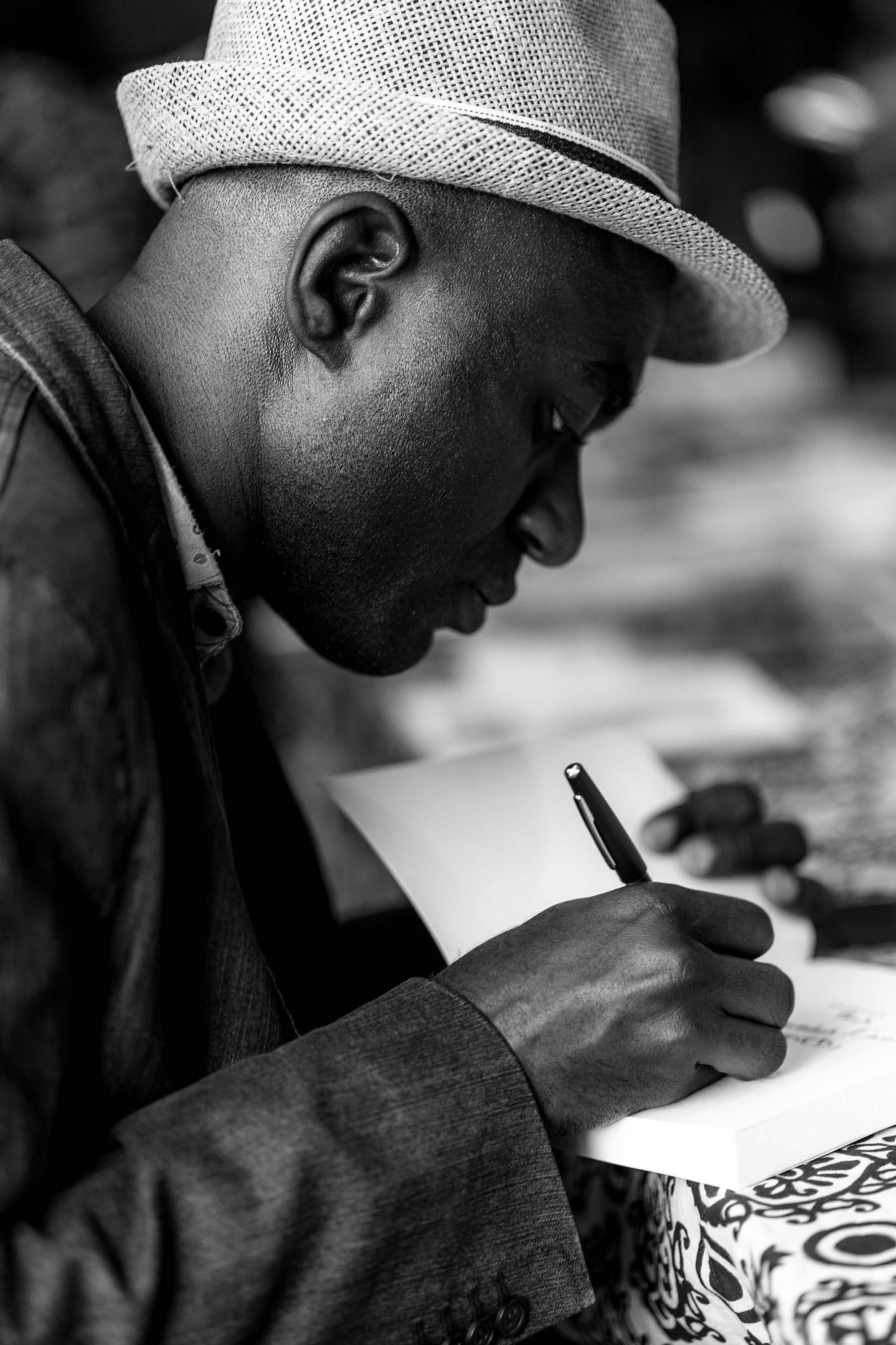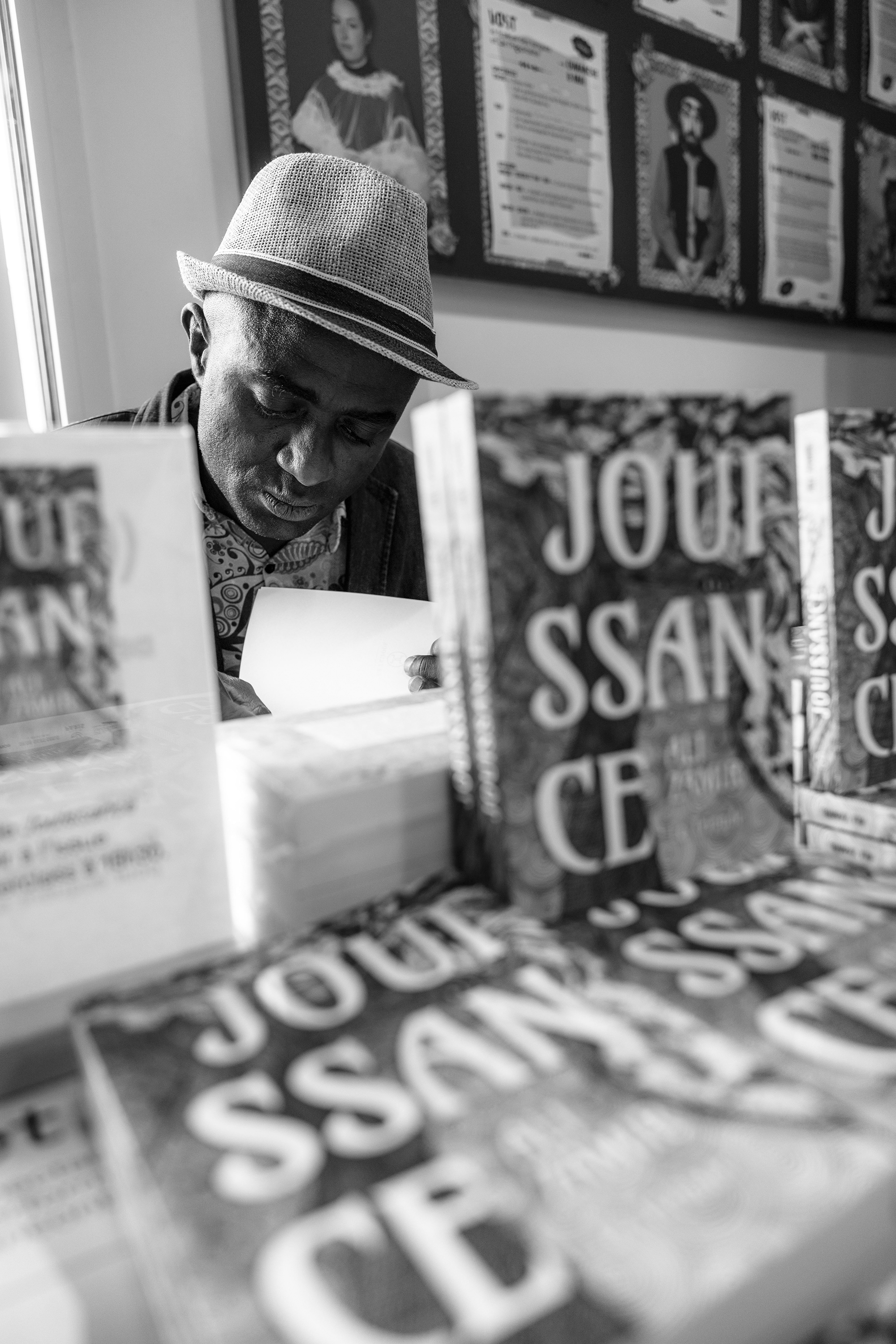 Ali Zamir en pleine dédicace. En conversation avec Mehdi Mekhlat et Badroudine Abdallah sur le plateau des Chichas de la pensée à Clichy (Copyright Homayoun Anoki).