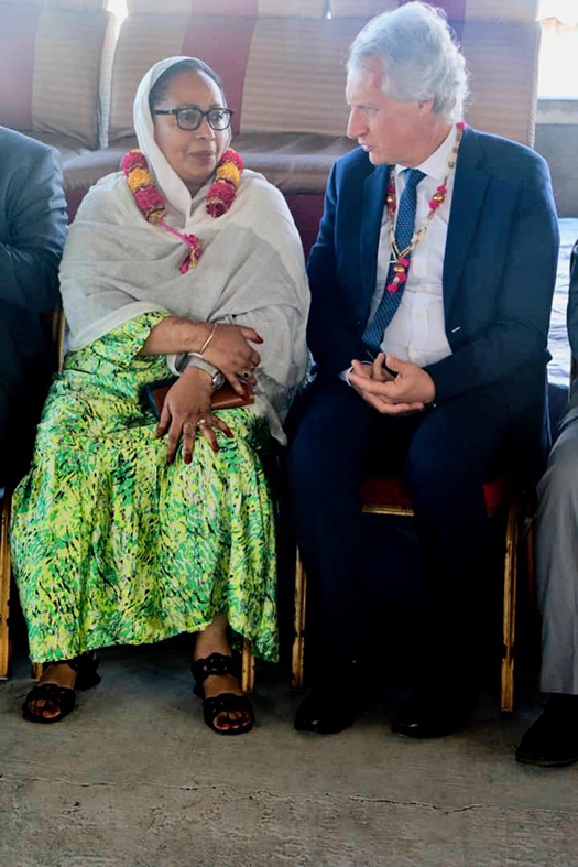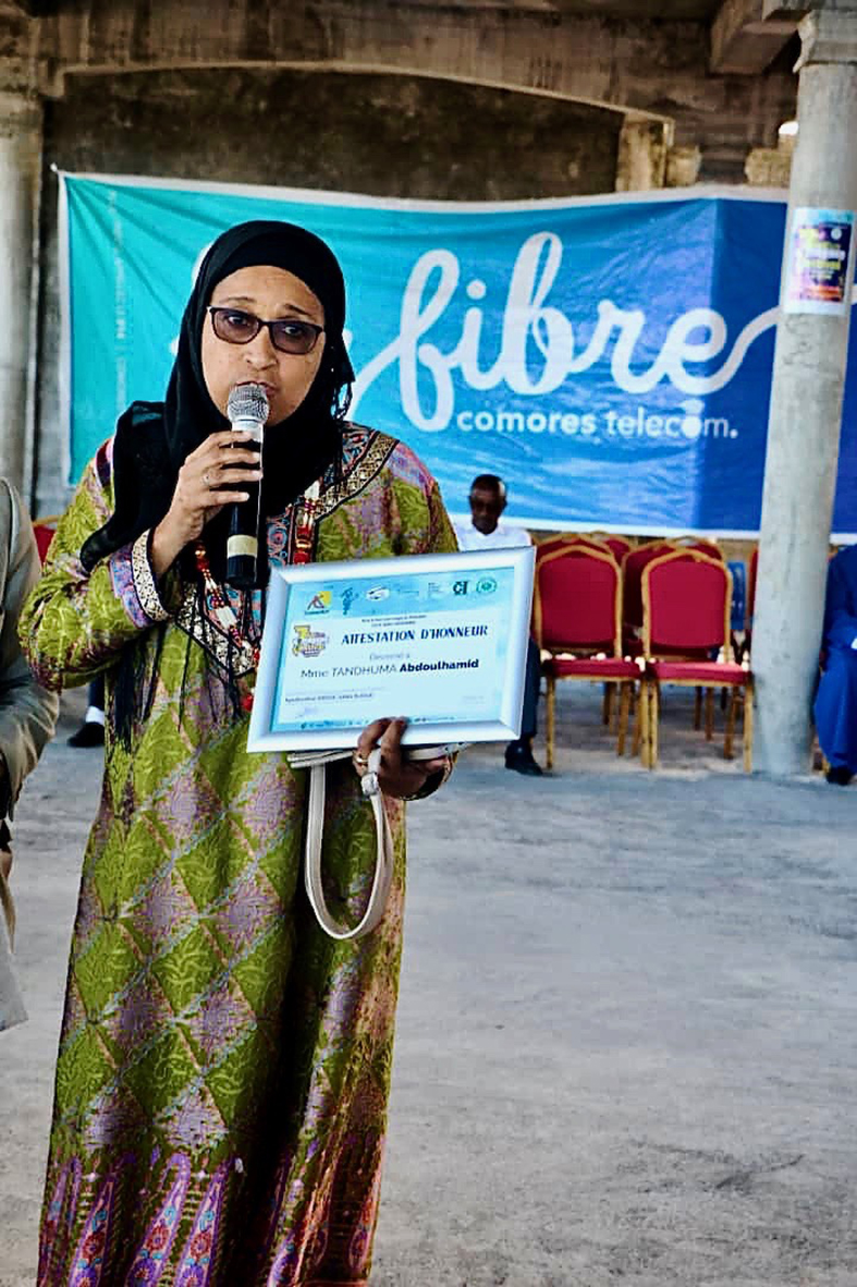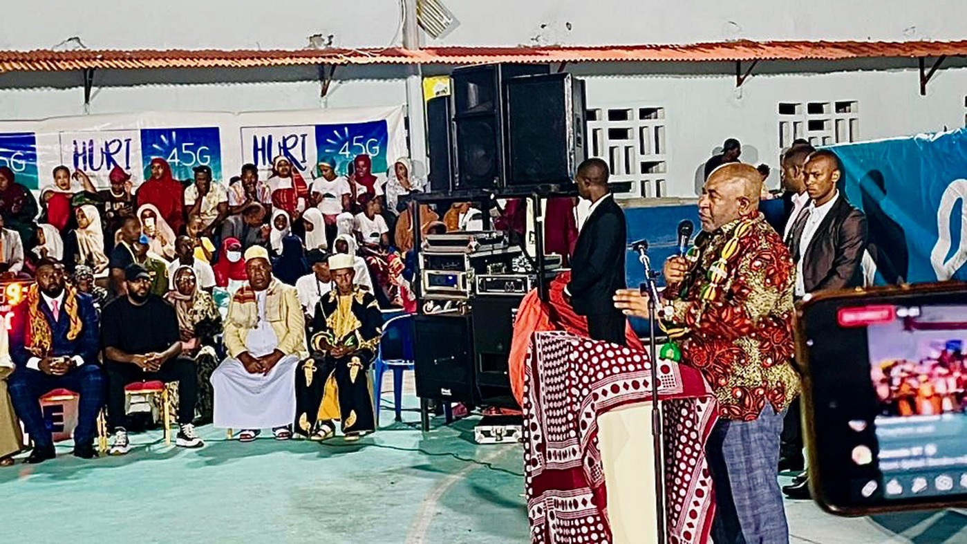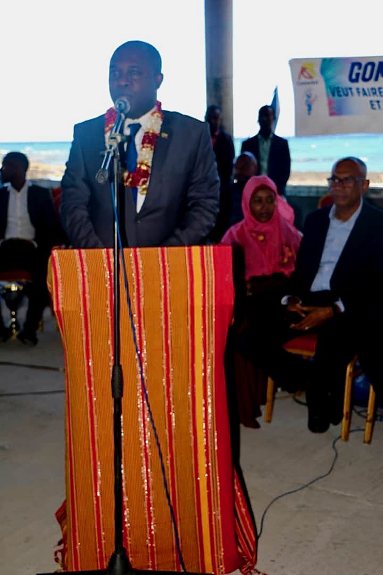 Le président Azali au micro. Yannick Mavel, conseiller culturel au Service de Coopération et d’Action Culturelle (SCAC). Saïd Ali Chayhane, directeur général de Comores Telecom. Wahidat Hassane, directrice nationale de la culture. SansBlague, directeur artistique du festival.