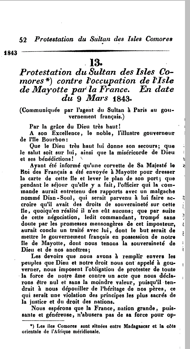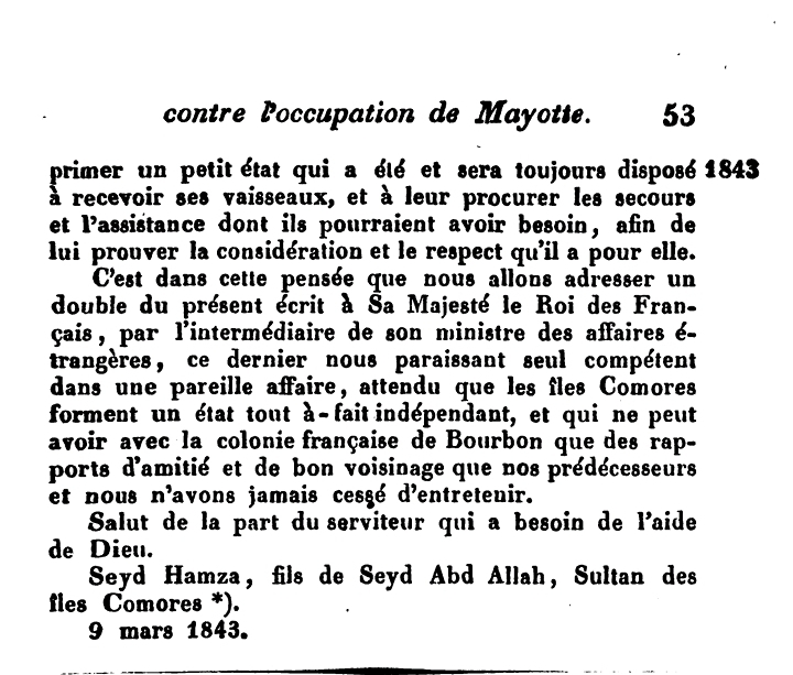 [17] Lettre montrée, par la délégation de Mohamed Chanfiou Ben Charafa, à l’ex-président français, Nicolas Sarkozy en 2009 à sa venue à Maore. Il était étonné de savoir que les îles Comores avaient déjà un sultan, en ces temps-là.