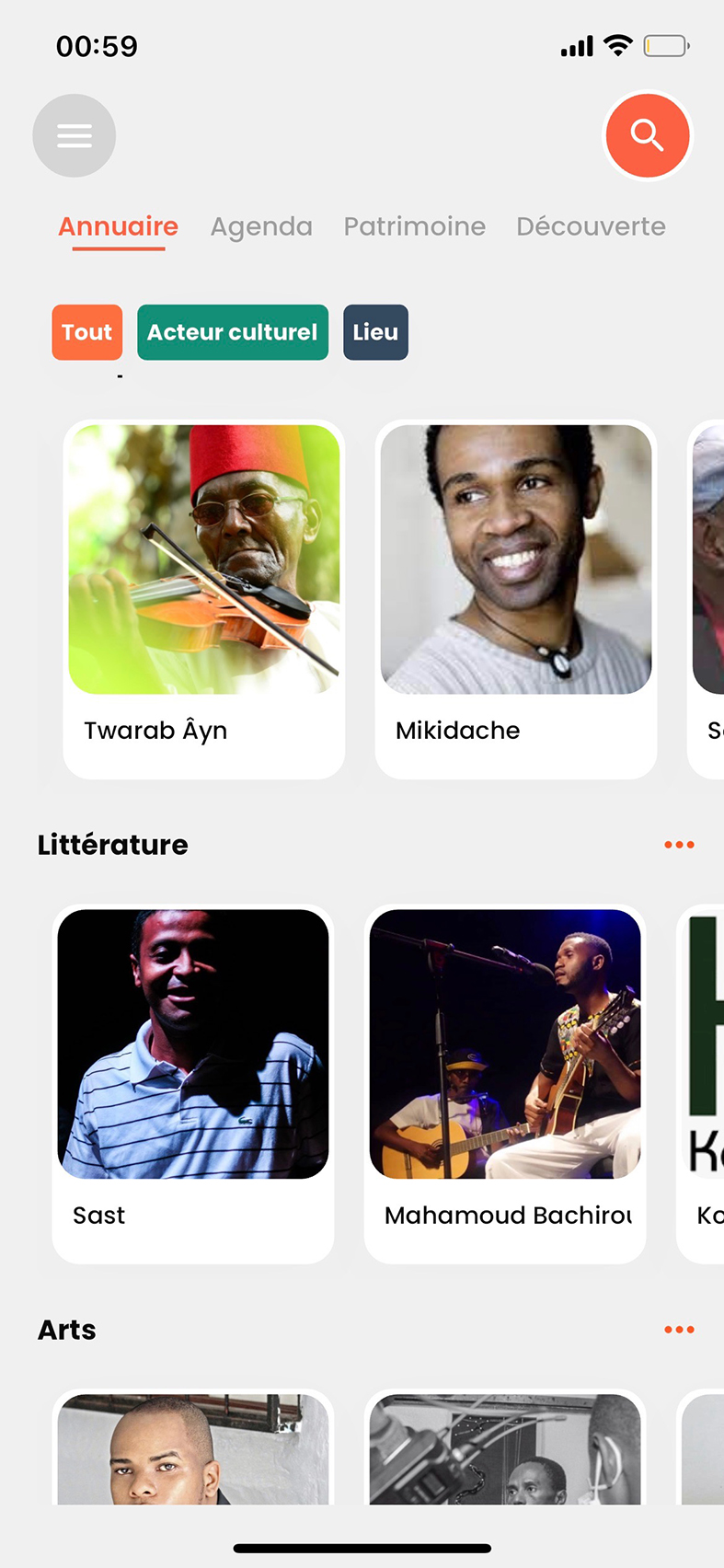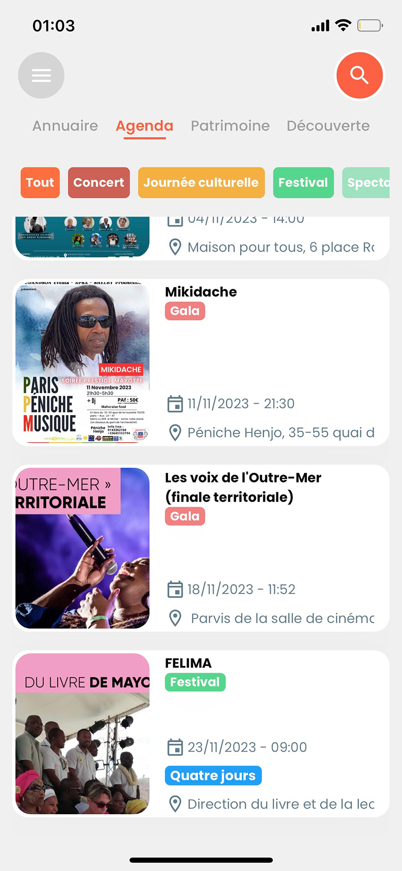 Sur Walimizi, il y a un agenda culturel. Si vous cherchez le moyen de nourrir votre planning du moment à Moroni, Mamoudzou, Paris ou Marseille, vous n’avez qu’à taper sur l’onglet d’à côté. Et si un événement n’y figure pas, celui qui l’organise peut le rajouter, en enregistrant l’information à même l’appli et depuis son mobile. L’association récupère l’info, la trie et la remet dans l’appli. De la même manière, un artiste peut y ajouter son nom, au même titre qu’un programmateur peut y repérer des talents émergents. Chacune des fiches enregistrées donne à voir l’essentiel d’un parcours : le rôle du contact en question (auteur, plasticien, musicien), le genre auquel il se raccroche (culture urbaine, littérature orale, cinéma), ses principales références dans le métier (festival, consécration, production) et son mail. On peut même y apercevoir des liens multimédias (vidéo ou presse) pour prolonger la découverte.