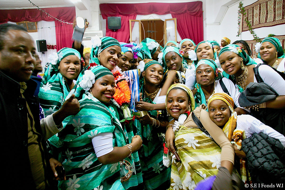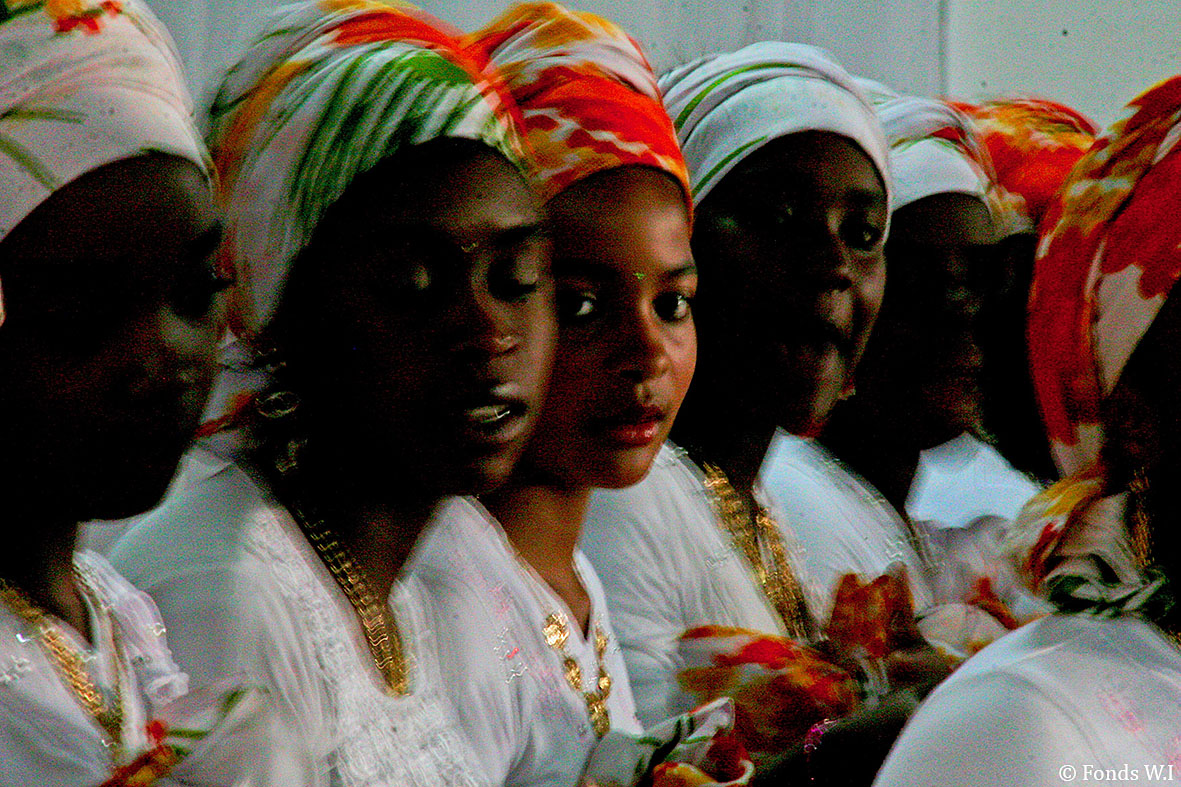 « L’alignement est une des normes chorégraphiques que les danseuses doivent respecter et que le contact avec les épaules aide à maintenir. Pour maîtriser l’effort et dépasser la fatigue, elles sont constamment sollicitées par l’imam à sourire, à ne pas montrer cet effort, à s’investir entièrement dans la danse et dans le chant »[2] Balancements des cous. Etoffes et couleurs en joie. Des parures et des coiffes, toutes aussi impressionnantes les unes que les autres. Masque de msindzano et boules de jasmin. Des mains aux motifs de henné dessinent des lignes suspendues dans l’espace. Des figures imaginaires signalées d’un même allant. Le haut du corps seul nourrit le tracé. Le hochement de tête se fait à l’unisson. Une geste raffinée, mesurée. De plaisir et de précision, toujours à la limite du rituel…