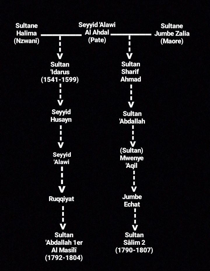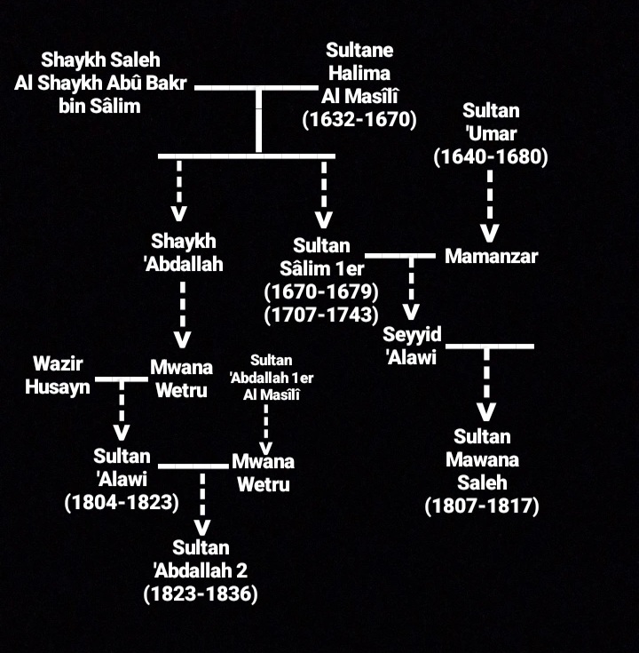 Feu Hachim Ben Saïd Mohamed m’a confié que ces deux personnes, mawana ‘Alawi bin Wazir Husayn al Maduwa et mawana Saleh bin ‘Alawi de la lignée des Abû Bakr bin Sâlim, étaient les arrières-petits-fils de la sultane Jumbe Halima II[8]. Celle-ci a régné de 1632 à 1670. Elle a été l’épouse du prince Seyyid ‘Alawi bin sultan ‘Abdallah al Masîlî de Pate.