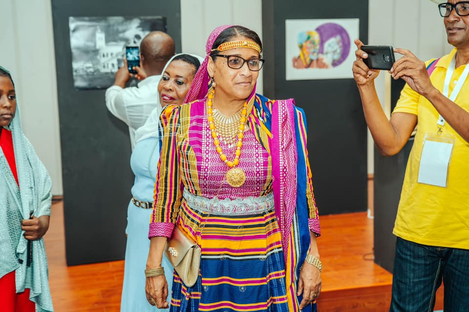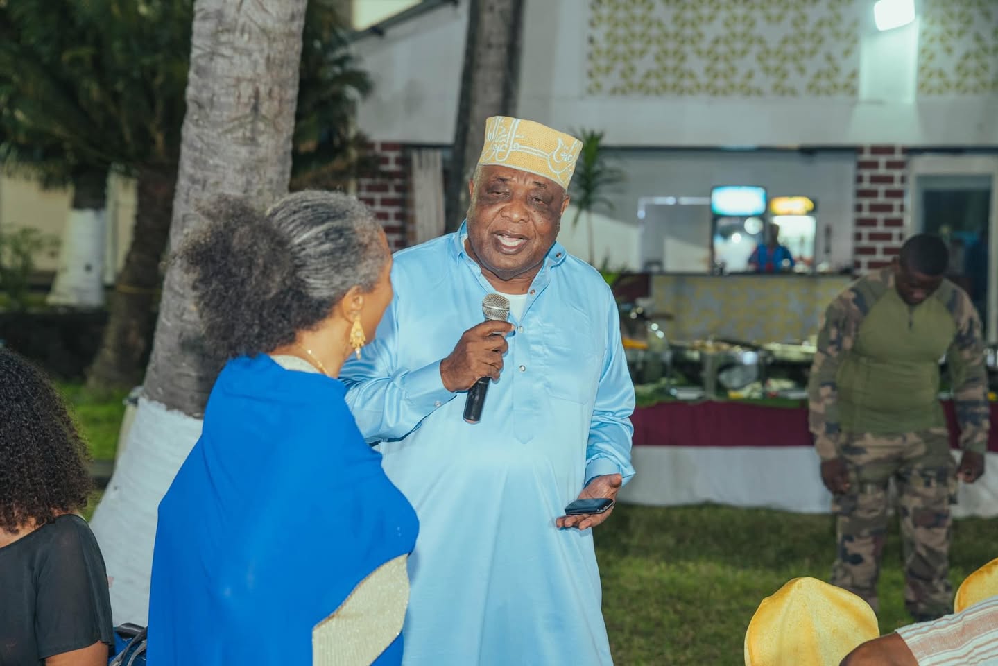 Mme Inayati Sidi, ministre chargée des arts et de la culture, Mme Wahidat Hassane, directrice nationale de la culture. Mohamed Badjrafil, ambassadeur des Comores à l’Unesco et parrain du festival, au milieu, en rouge. Mme Fatima Ousseini, présidente du festival et Simon Njami, cirtique et président du jury du FACC.