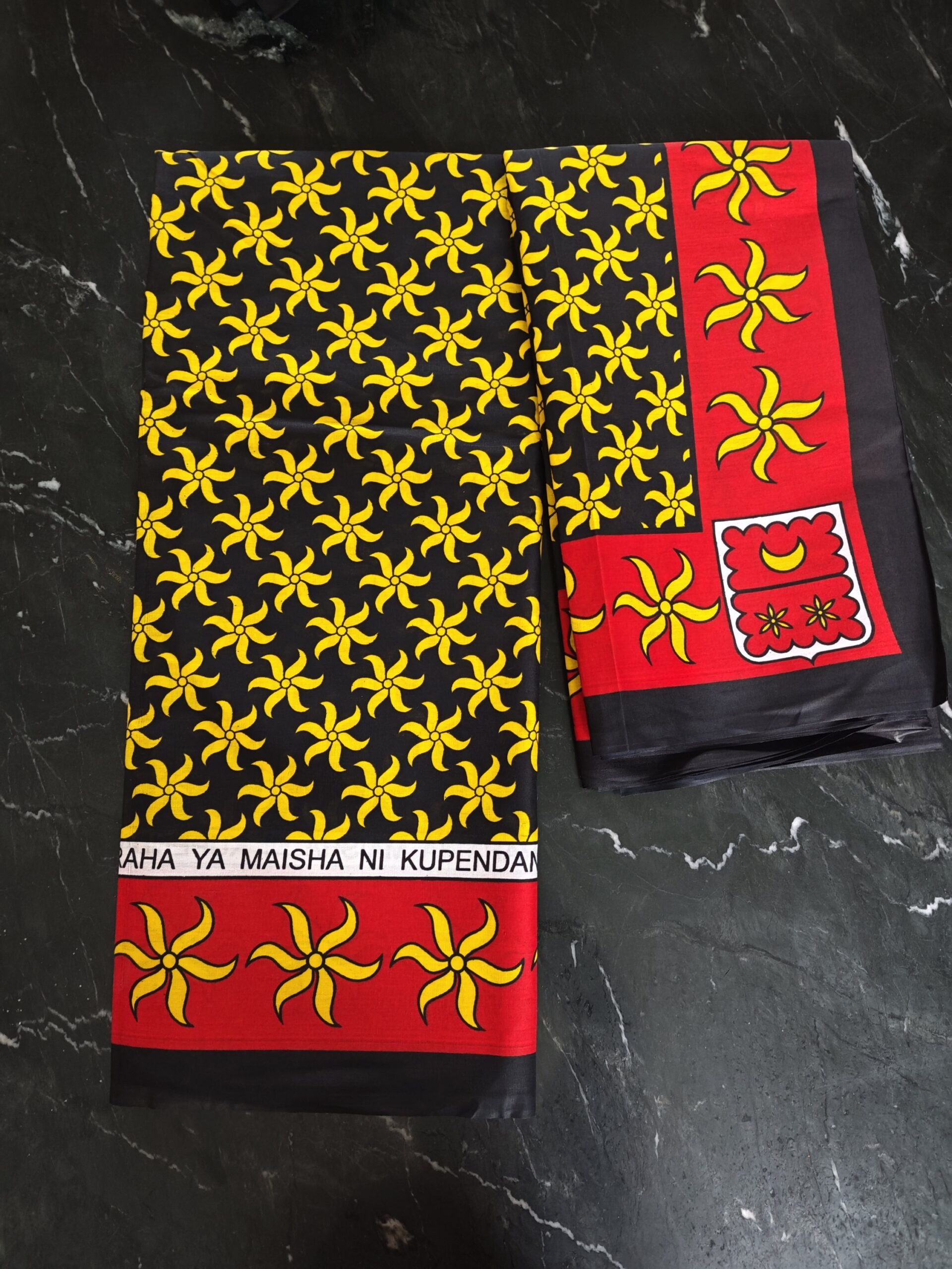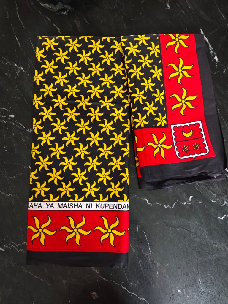 Ils sont aussi l’occasion de « passes d’armes » entre rivales. Les déclarations (amicales ou inamicales, polémiques, expressions de sagesse populaire…) se font à distance, par le biais de sous-entendus, de paroles imagées lancées comme par hasard au passage ou à proximité de la rivale, et par le biais de tenues et de parures qui ne sont jamais neutres (…) Le nyambawani se présente ainsi comme le lieu d’une rencontre de la parole féminine, intime et réservée, avec le monde social et public, qui peut paraître comme antinomique (…) Les inscriptions sont en capitales de petite taille encadrées par une ligne de même couleur qu’elles.