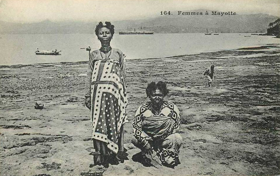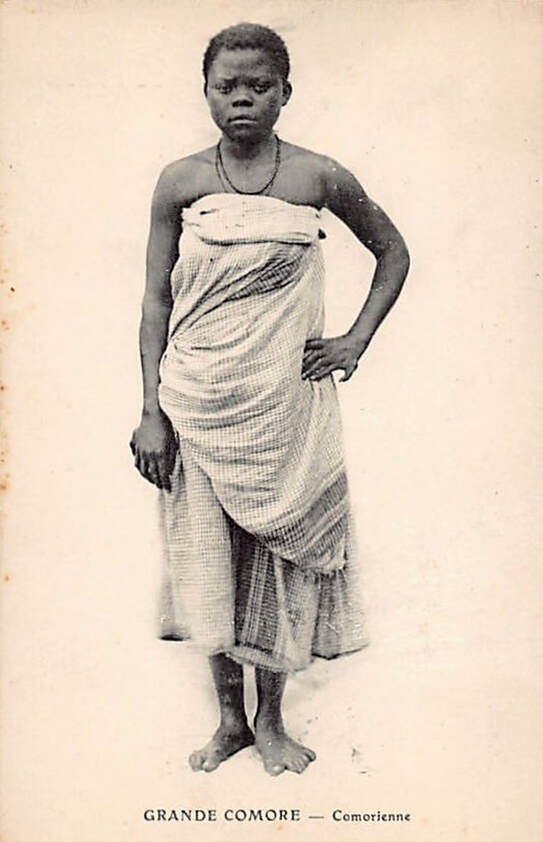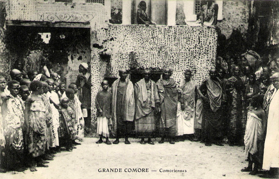 Solidement implantées, les coutumes vestimentaires comoriennes sont pourtant relativement récentes. La tradition orale comme les récits de voyageurs décrivent une population à l’habillement rudimentaire. « Avant l’introduction du métier à tisser par les maferembwe[1], les Comoriens s’accommodaient de feuilles de bananiers et de peau de bête », rapporte ainsi Moinaecha Cheikh dans Ya Mkobe. « Les hommes se couvraient les parties intimes et les femmes se souciaient de se couvrir la poitrine aussi. Après le XIe siècle », poursuit la linguiste, « vinrent les maferembwe tisserands ; les étoffes qu’ils confectionnaient à base de coton et de fibres de bananier n’étaient portées que par les plus aisés. Ces étoffes étaient aussi bien portées par les hommes que par les femmes ; en pagne, en boubou et en écharpe. Pendant la même période, les plus pauvres portaient les sacs qui ont contenu du riz ou de la farine, décousus et portés en pagne, et les nattes. Il faut noter que les maferembwe n’avaient pas les moyens de produire des étoffes en grande quantité (les techniques étaient rudimentaires, et la quantité de coton était assez limitée). »
