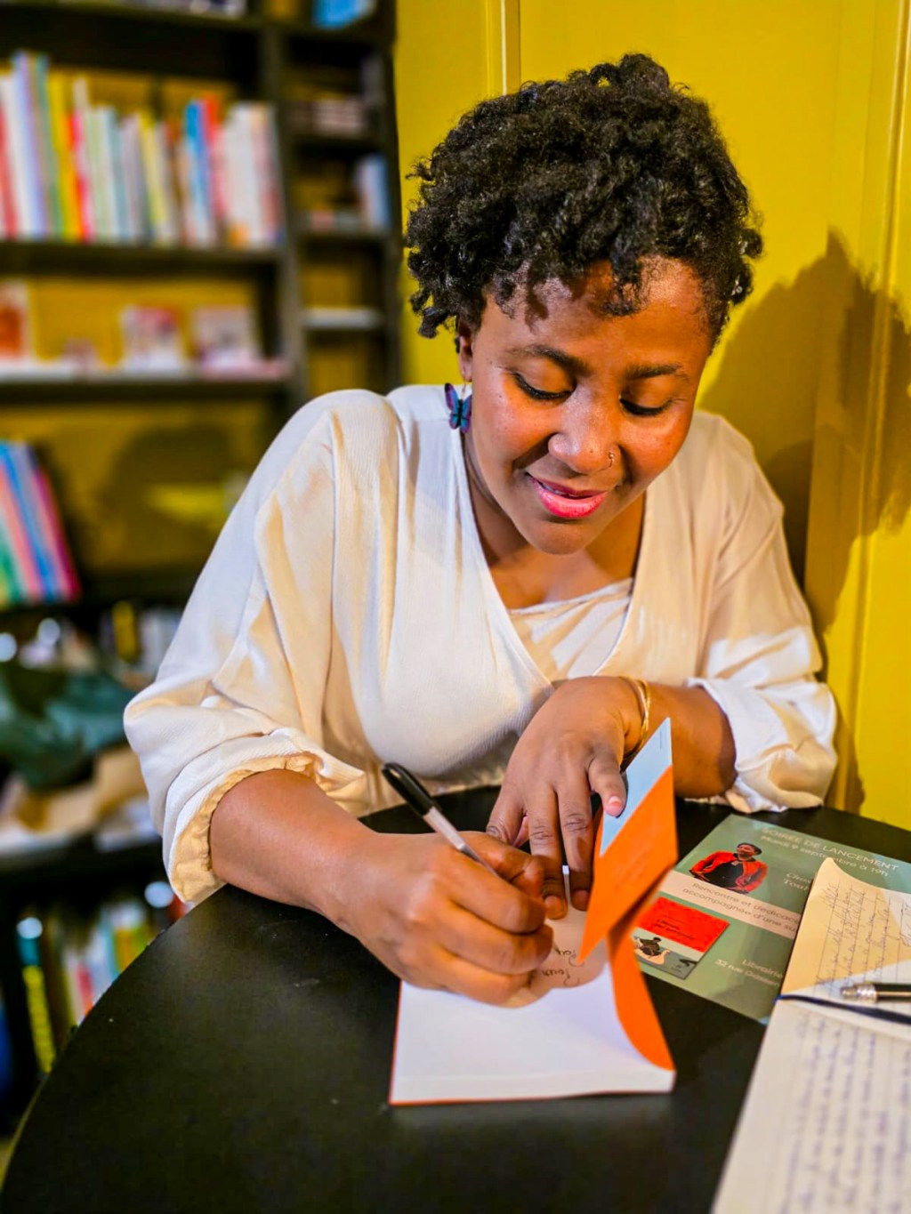 Âmes suspendues puis Vert cru jusqu’au feu du milieu, chaque couverture des livres de Touhfat Mouhtare portait une symbolique onirique, mais distanciée. Par les couleurs ou le sujet mis en scène, on y devinait un imaginaire fictionnel. Ici, sur le bandeau qui cercle le format court de son nouveau récit, c’est l’autrice qui est au centre. Elle est reconnaissable à sa chevelure qu’elle arbore comme à son habitude au naturel. La dessinatrice et journaliste Justine Sow[2] l’illustre sur une eau sans remous, portée par un cygne et tenant une corde pour pagaie. Le serpent de Mami-Wata[3] a switché en une queue reptilienne, celle de Gustave. Pourquoi un crocodile ? Pourquoi un cygne ? Peut-être est-ce la corde à 11 nœuds, qu’elle est train de nouer, qui laisse le mieux deviner la bascule. À la librairie Calypso, ce 9 septembre à Paris, l’autrice déclare ne plus tenir l’écriture de la même manière. Comme si Choses qui arrivent portait une catharsis exutoire.