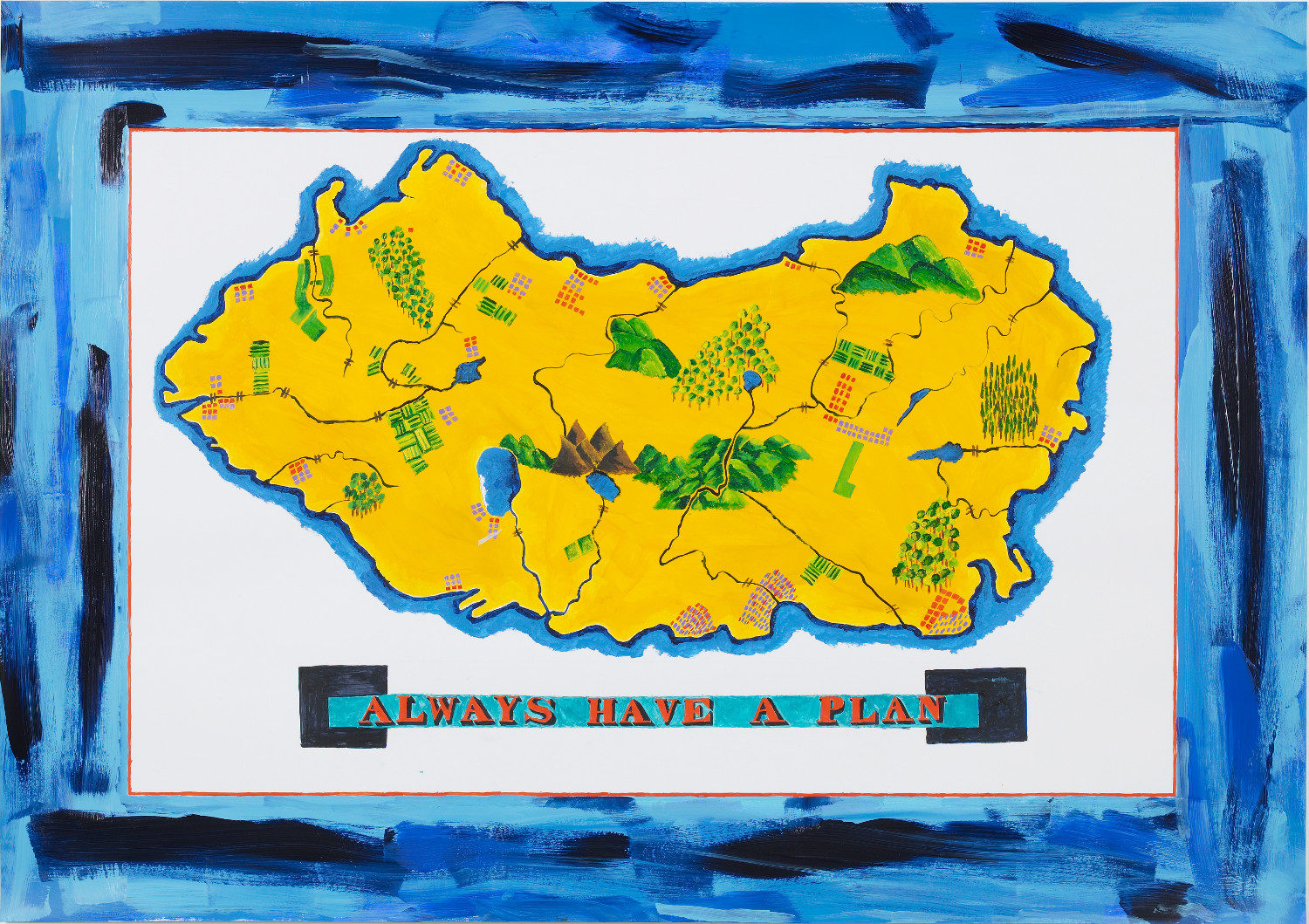Les réflexions de Himid sur son œuvre témoignent de son intérêt pour le « processus », qui découle de sa formation en scénographie. Pour elle, le théâtre « était un lieu où l’on peut faire bouger les choses, où tout change : les costumes, les décors, les lieux, les émotions ». L’artiste a transposé la mutabilité constante d’une représentation théâtrale dans son installation Zanzibar. Les coulées de pigments bleus et verts ruisselant sur les toiles, associées à la bande-son atmosphérique en boucle, évoquent le caractère insaisissable de l’identité. Bien que Zanzibar, le lieu, soit un élément crucial de la biographie de l’artiste, l’installation Zanzibar explore la manière dont quelque chose d’aussi fondamental pour son identité repose sur des fragments. Le processus consistant à récupérer ces fragments et à les façonner pour en faire un sentiment d’identité est nécessairement vain et imparfait.